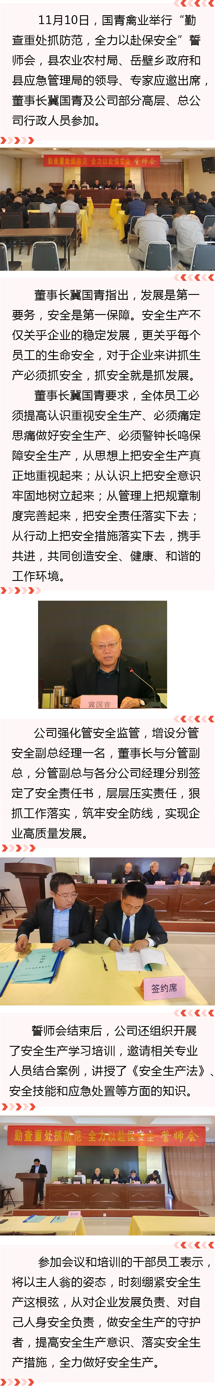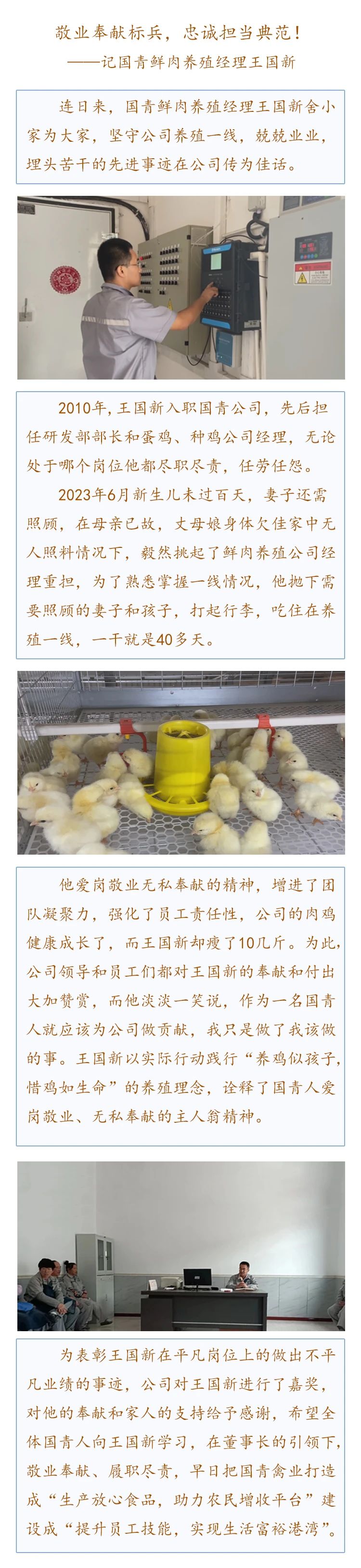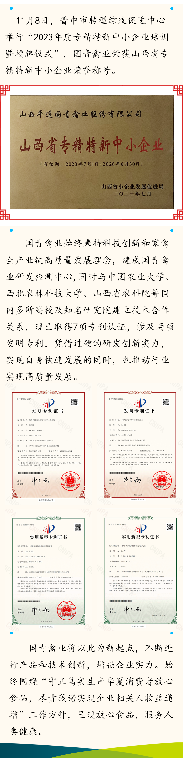 國(guó)青禽業(yè)是山西省農(nóng)業(yè)產(chǎn)業(yè)化重點(diǎn)龍頭企業(yè),起步于1992年,三十年來(lái)始終專(zhuān)注家禽養(yǎng)殖,現(xiàn)己成為集種禽飼養(yǎng)、雛雞孵化、飼料生產(chǎn),蛋、肉雞養(yǎng)殖、屠宰、熟食加工、有機(jī)肥生產(chǎn)的循環(huán)經(jīng)濟(jì)產(chǎn)業(yè)鏈典型企業(yè)。公司設(shè)六部、六公司,十五個(gè)生產(chǎn)廠(chǎng)。截止目前為止,總資產(chǎn)3.5億元,員工500人,擁有“傳康”“潔安佳”“同盈”“澤田園”4大品牌,生產(chǎn)銷(xiāo)售雞苗、飼料、雞蛋、白條雞、熟食、肥料6大系列36種產(chǎn)品。
